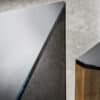 In the wooden top version the base is made up of a smoked glass element and a black laminated glass element.