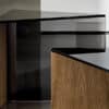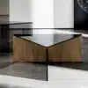 In the glass top version the base is composed of a smoked glass element and a wooden element.