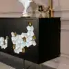 Precious materials and exclusive upholstery: the Gaudì sideboard combines uniqueness, beauty, attention to detail and craftsmanship, for an aesthetic effect inspired by the works of the Spanish architect Antoni Gaudì. The doors of this precious sideboard are covered with a fluid application of ceramic macro mosaics with shining shades, made and applied by hand by BottegaNove’s master craftsmen. A coating that gives a sensation of movement and creates an evocative surface, thanks to the elements that combine with each other in surprising chromatic shades: 107 mosaic petals in white ceramic, mother-of-pearl and shiny pure gold.