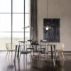 The Milos table has an industrial style, its slender and light lines defined by legs made out of metal tubes, flattened at the bottom.