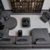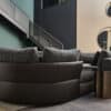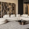 The Modular oasis sofa includes different modules with two/three seats each. The internal structure is made of beech wood and poplar multilayer with multilayer inserts, the springing is guaranteed by undeformable elastic straps. The structure is covered in high-density polyurethane foam with two different densities, the upper layer having a high elastic component. The cushions are made in non-deformable and variable-density feathers, and a synthetic layer. A laser-cut bronzed metal plate envelops the sofa, functioning as a decoration and simultaneously creating a luminous reflection in the upholstery. The chaise longue has an extended backrest used to contain the pouf. The pouf is covered with a delicate tufted upholstery. The round island has a circular back with a padded metal structure, upholstered in leather This modularity allows the creation of different shapes, depending on the chosen modules, that can be rearranged from time to time.