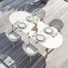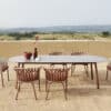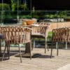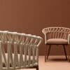 The band in acrylic fabric overlaps the rope weaving that covers the aluminum frame, drawing the surface of the backrest with diagonal lines. A double weaving that becomes an iconic motif of this elegant armchair for the outdoors.