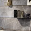 Modular wall system with a combination of boiseries, shelves and storage units.