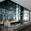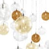 Lamp with ceiling support in white, black or mirror glass and suspended spheres in clear smooth borosilicate glass with led bulbs inside. Allows various types of customizations for dimensions and shapes. Available as single pendant lamp and with coloured spheres.