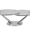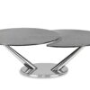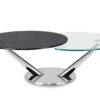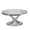 EXTENDABLE TABLE WITH SYNCHRONIZED REVOLVING GLASS TOP. BASE AND SUPPORTS IN PAINTED OR GALVANIZED STEEL. THE BASE IS EQUIPPED WITH A MECHANISM FOR SYNCHRONIZED ROTATION, WHICH ALLOWS FOR BROAD MODULATION OF THE SHAPE. ALSO AVAILABLE WITH CERAMIC TOP.