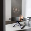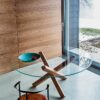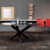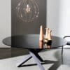 Dining table with base in wood, various finishes, or in metal, polished chrome, lacquered or burnished finish. Top available in tempered glass or wood, various finishes. Top available also in the exclusive Liquid Glass finish.