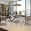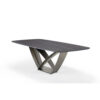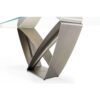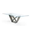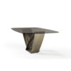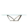 Dining table with iron base in Bronze (100M), brass (104M), dark brass (105M), titanium (101M) finishing. Top in transparent glass, extraclear glass, smoked glass, MarmoReflex or Legnoreflex. Bevel Wood top in Canaletto walnut or in Canaletto Henné or Bevel Wood top with cover in Marmoreflex/Legnoreflex.