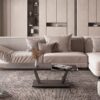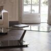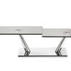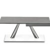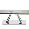 EXTENSIBLE COCKTAIL TABLE WITH SYNCHRONISED REVOLVING GLASS TOPS. BASE IN STRATIFIED GLASS. SUPPORTS IN PAINTED OR GALVANISED STEEL. AVAILABE ALSO WITH CERAMICS TOPS.