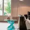 A spiral developing upwards, made of thin glass bricks that provide light refraction, playing with colors and reflections.