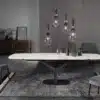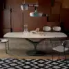 The strength of steel is made soft and agile in this table thanks to the curves forming the base. Glass, ceramic or porcelain stoneware tops available in all Tonin Casa finishes, are placed securely on aluminum rails designed to combine elegance and functionality.