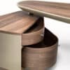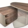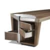 Desk with structure in Canaletto walnut or in shiny ebony wood and top-edge covered in leather. Top available in Canaletto walnut, shiny ebony wood or in Marmoreflex/Legnoreflexc glass. Equipped with compartment for plugs and connections and unit with drawer and filing-drawer with edges and details in steel. Available with leg in black or pearl-grey Murano glass (A model) or with swivel drawer’s unit (B model)