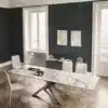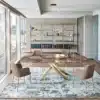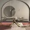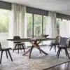 Table fix or with extensions, with lacquered Metal frame. Top in Solid wood, Veneer wood with solid edge, heritage walnut Solid wood, Veneer wood, lacquered Wood, Glossy glass, Velvet matt anti-scratch lacquered glass, Superceramic, SuperMarble or natural Marble.