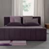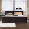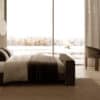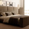 Upholstered bed with foot board, covered with fabrics and leather from our own collection.
