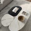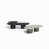Atollo coffee tables have tops resembling irregular ovals. They are made of stoneware or in matt, glossy, concrete-effect or metal lacquer, in a wide color chart, which also includes special micalized proposals, that is, with tiny shiny dots.