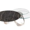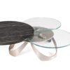 EXTENSIBLE COFFEE TABLE WITH 3 TOPS IN GLASS OR CERAMIC. EQUIPPED WITH AN EASY AND INNOVATIVE SINCRONYZED OPENING MECHANISM THAT ALLOW, WITH A SIMPLE GESTURE, THE 3 TOPS TO BE OPENED AT ONCE AND TO BE AT THE SAME TIME PLACED IN DIFFERENT DIRECTIONS. FRAME IN PAINTED STEEL.