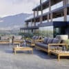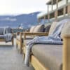 A structure with clean and regular lines in solid teak wood combines with large and soft cushions to give shape to a spacious and comfortable seat, which invites you to immerse yourself in relaxation.