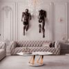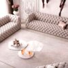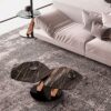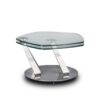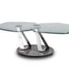 EXTENSIBLE COCKTAIL TABLE WITH SYNCHRONIZED REVOLVING TOPS IN GLASS OR CERAMIC SELECTIONS. BASE IN CERAMIC OR IN PAINTED FINISHINGS. SUPPORTS IN PAINTED FINISHINGS OR GALVANIZED STEEL. THE BASE IS EQUIPPED WITH A MECHANISM FOR THE SYNCHRONIZED ROTATION OF THE TOPS THAT ALLOW AMPLE MODULATION OF THE SHAPE.