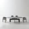 Attractive and refined shapes give rise to a composition comprising a table – in various sizes – and a chair – covered with leather or fabric. An original and concurrently classic look for the set, like an urban landscape which harmoniously brings together different souls.