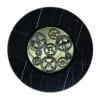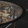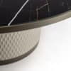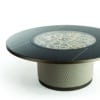 Dining table with cylinder-base upholstered in leather CAT.C or NABUK with quilting. Wooden top 40mm thick with a cover in Marmoreflex/Legnoreflex. Edge of the top and bottom section of the cylinder in the metallic finishes (Bronze (100M), brass(104), dark brass (105M9, titanium (101M). Built-in Lazy Susan in transparent glass with gears in shiny gold and chrome on a bottom in Mesh glass. Optional electrical motor for the Lazy sausan mechanism.