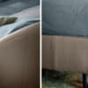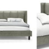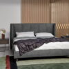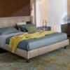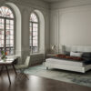 The clip pinches the edges of the continuous surface of the covered panel, generating an overhang in the fold and enhancing the well-tailored qualities of the fabric. This exactingly crafted embellishment is duplicated in the corners of the bed frame, becoming fibula and foot alike. The headboard is a meticulous rectangular-shaped panel, folded on the sides, at once a protective niche and a refined aesthetic element. The vast, generous lenticular surfaces are taut yet accommodating, enhancing the experience of intimate comfort that makes the night an endless adventure.
