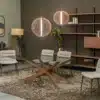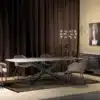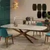 Table with a single central base painting steel base or with a wooden cover that opens towards the top with lightness and elegance, making it the protagonist of the scene.