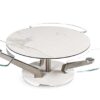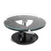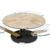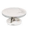 EXTENSIBLE COFFEE TABLE EQUIPPED WITH AN INNOVATIVE MECHANISM THAT THROUGH THE UPPER ROUND TOP 360° ROTATION, ALLOWS THE LOWEST 3 SMALL TOPS TO OPEN AUTOMATIOCCALY . IN CLOSED POSITION THE LOWEST SMALL TOPS ARE HIDDEN BY THE ROUND UPPER TOP.