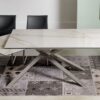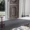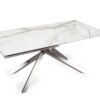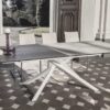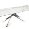 EXTENSIBLE DINING TABLE WITH TOP AND EXTENSION IN GLASS OR CERAMIC. LEGS IN PAINTED STEEL EQUIPPED WITH A PECULIAR AND INNOVATIVE MECHANISM: BY THE SIMPLE ROTATION OF THE EXTENSION, THE MAIN TOP MOVES AWAY AND CLOSES BACK ALWAYS KEEPING ITS CENTERED POSITION ON THE BASE.