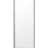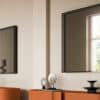 The four smoked glass sides framing the mirror lend lightness and three-dimensionality to a traditionally two-dimensional object. The recessed position in the frame creates the illusion that the mirror surface is transparent and reveals another space on the other side of it.