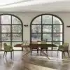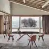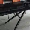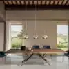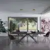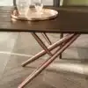 Fixed or extendible table with barrel shaped top or rectangular. Frame and decorative details in lacquered metal.