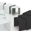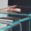 Smoked, extralight clear or lacquered mono or two-tones, bent glass coffee table.