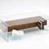 Coffee table in clear or extralight bent glass with glass shelf. White opened pores, wengé, canaletto walnut drawer.