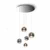 Chandelier with support in white or black lacquered or mirror glass and pendant spheres in blown borosilicate glass in sputtering finish bronze, gold, silver or copper or in Pulega finish with LED. It is possible to realize customized versions for dimensions, length and shape.