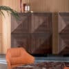 C-Wood is made entirely of wood and comes in two different finishes. The doors and side panels are in veneer with a hand-worked diamond pattern. Small variations in the uniformity of the door colour are due to the fact that the wood is worked by hand.