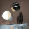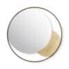 It is composed of a round external structure in solid steel with a square section, into which are inserted both a circular mirror and a steel half moon that can be customized with different kinds of finishes and decorations.