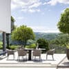 Soft curves outline the backrest and armrests of the Clever bucket chair. Light and elegant, this seat is the ideal choice for decorating the outdoor area or the veranda of a restaurant, or the outdoor dining area of a private residence. The shell upholstery in VAR#TEX has been created specifically for outdoor use and ensures excellent resistance of the Clever bucket chair in all weather conditions.