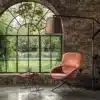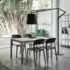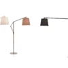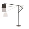 Floor lamp with frame and base in lacquered metal and adjustable arm in lacquered aluminium. Lampshade in fabric.
