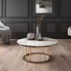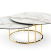 EXTENSIBLE COCKTAIL TABLE WITH CERAMIC TOP, PAINTED OR GALVANIZED STEEL BASE. EQUIPPED WITH AN INNOVATIVE MECHANISM THAT ALLOWS THE LOWEST 2 SMALL TOPS TO OPEN AUTOMATICALLY.