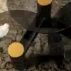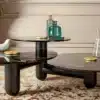 The elegance and harmony of pure forms characterize the Cosmo coffee table, consisting of three glass tops with a central satin gold button and solid wood base. The different heights of the three tops enhance its powerful aesthetics.