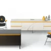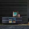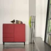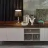 Wooden storage unit available with doors, drawers, baskets or open spaces. Groove opening system. Inside shelves in clear Glass. Top, frontal and side panels in Glossy glass and Velvet matt anti-scratch lacquered glass.