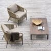 The lounge armchair of the Cricket collection stands out for the hand weaving of the rope backrest. Its twisting is a precious element of craftsmanship, a refined detail that enhances its shape and design.