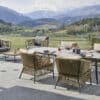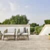 A spacious cushion on the seat and a softer one on the back make this armchair inviting, chosen by many architects and designers to furnish domestic and contract outdoor environments.