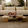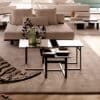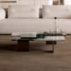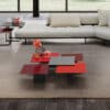 Vertical over horizontal and horizontal over vertical. Geometric lines evolve through space, creating different colour combinations. With their precision design, these modern low tables are one of a kind.