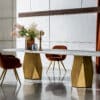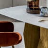Dining table with lacquered metal bases, various finishes. Tempered or laminated top in different measures, materials and finishes.