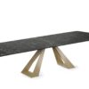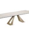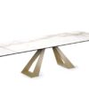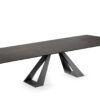 Extensible dining table, with top and extensions of glass. Base and track of painted metal. A very easy patented mechanism to pull out the lateral extensions allows the widening of the top of cm 80. Availabe also with ceramics tops.