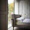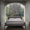 The DOMINICK bed, designed by architect Enrico Cesana, has all the charm of a linear design with a soft and welcoming character. The bed has a curved solid wood structure that wraps around the padded backrest and a design bed frame with a micro-perforated solid wood resting surface, to ensure maximum breathability. The DOMINICK bed is also available in the version with ring H.30 with one or two movements container bed frame.