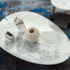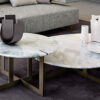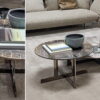 The satellite tables, described as occasional furniture, fit perfectly within multiple living scenarios, gravitating around upholstered pieces showcasing their versatility at the front, back or side.