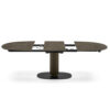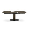Extendable table with central base and fully automatic opening mechanism. The base is made of sheet metal, while the round section column is separated from the ballast by 3 cm, highlighting an inner band that can be customized in 4 colors. The extension, placed in the center of the table under the two semi-tops, It rotates when opened until it aligns with the lid. A slight push of the half-lid locks the mechanism. To close the table, simply perform the opposite operation.