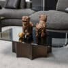 Conceived in three shapes and three sizes, they consist of a glass top with a visible grinding at the top. The base is made of curved steel with concave, welded, and smooth curved sections which create an elegant play of light and dark with any finish. The smallest table, tall and rectangular, is perfect to be positioned at the side of a sofa, while the classic position for the low and large coffee table is in front of a sofa. The L-shaped table is perfect for sofas with peninsulas, or a chaise longue.