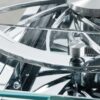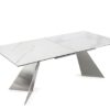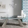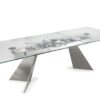 Extensible dining table with glass or ceramic tops. Legs in chromed or painted steel. Equipped with a synchronized mechanism for lateral extensions widening and central extension lifting. Available with or without remote control.