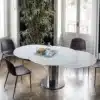 Round extending table, telescopic synchronised opening mechanism. Top and extensions in Glossy glass and Velvet matt anti-scratch lacquered glass.